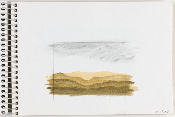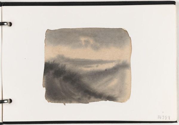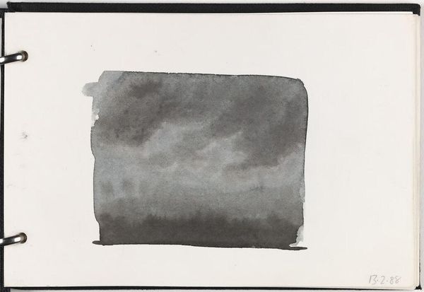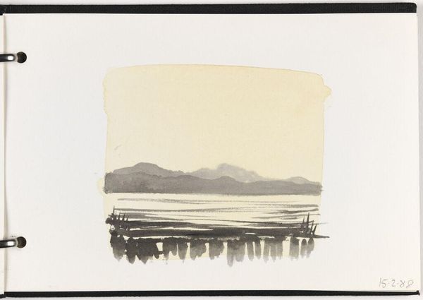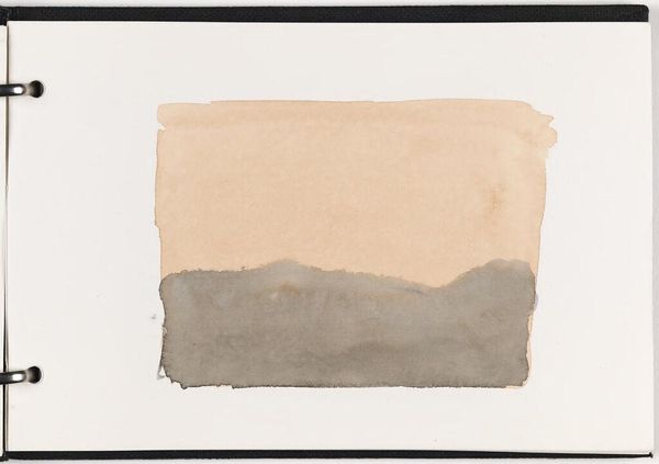 Curator: Elena Prentice's watercolor work, simply titled "Landscape," presents us with a minimal vista, measuring only about 12 by 18 centimeters. Editor: My first impression is one of quietude. The muted tones and the stark simplicity evoke a sense of calm contemplation, almost melancholic. Curator: It's interesting how Prentice uses such a limited palette. The gradation from the pale sky to the dark, layered mountains creates depth despite the painting's diminutive scale. It’s as if she is showing how grandness can be shown through a small window. Editor: Indeed. The layered mountains almost read as archetypes, standing in for all mountain ranges, embodying the unchanging Earth. This artwork feels both personal and universal, and the technique gives the scene the feel of an ancient myth. Curator: The unadorned style also lends itself well to public interpretation. It has the feeling of a universal landscape, something we all could recognize. Editor: I agree. It's a powerful piece that reminds us that even the simplest of images can carry profound emotional weight. Curator: A sentiment Prentice expresses so well in this landscape.