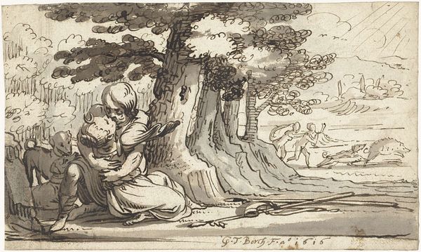 Curator: Here we have a drawing titled "Lovers in a Cave" by Pieter Tanjé, a Netherlandish artist. It’s rendered in ink, graphite, and what appears to be watercolor, creating a wonderfully layered effect. Editor: It strikes me as dramatically lit, like a stage set, despite being just ink and wash. It has this secretive, almost feverish energy, with the central pair contrasted against figures in pursuit on the left. Curator: Indeed, that contrast is key. The scene plays with familiar Baroque tropes, positioning idealized lovers in what should be a pastoral setting, yet chaos encroaches upon their intimacy. It reflects the era's social anxieties about the fragility of love and leisure amid political upheaval. Editor: The cave as a symbolic space feels especially potent here. Caves historically represent both refuge and the subconscious—a place of hidden desires and potential danger. Are the pursuers symbolic of internal conflicts or external societal pressures threatening their idyll? Curator: Possibly both. The open-ended narrative speaks volumes. Consider Tanjé's other works: he often engaged with theatrical designs and genre scenes reflecting the lives of the wealthy elite, perhaps satirizing their preoccupations while acknowledging their cultural influence. This drawing fits neatly within that context. Editor: It does, doesn't it? The fallen arrows in the foreground seem to imply that even love, when removed from society’s approval or context, may come at a price. Weapons discarded or ineffective—it amplifies that feeling of vulnerability despite the embrace. Curator: Precisely. There's a performative aspect too; Tanjé's elegant draftsmanship lends a certain theatricality, inviting us to ponder not only their individual predicament, but how such images functioned within 18th-century artistic circles, where romance, moralism, and escapism frequently intertwined. Editor: I'm left wondering what stories those cavern walls would whisper if they could talk! It's a very engaging drawing that definitely marries passion with that looming feeling of disruption that echoes even today.