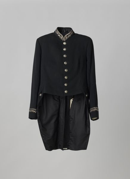 Editor: This is a cutaway coat, created sometime between 1860 and 1865, made of textile, and designed by Brooks Brothers. It looks so formal and restrictive. What can you tell me about this garment in the context of the time it was made? Curator: This cutaway coat embodies a very specific idea of masculinity and social hierarchy. Think about the Civil War era – what did clothing represent for different groups? How did fashion become a visual marker of class, allegiance, and even political leaning during such a polarized time? Editor: I guess I hadn't thought about it that way. It's easy to just see it as a fancy coat. Curator: Exactly. This wasn’t just any coat. Its rigid structure, the dark color… these were deliberate choices that spoke volumes about the wearer’s status and adherence to social norms. Consider also the labor that went into its construction, likely by enslaved people, if the textiles originated in the American South. The very fabric is implicated in systems of oppression. What does it mean to see an object of supposed refinement born from such injustice? Editor: So it’s not just about aesthetics, but also a reflection of power dynamics. Curator: Precisely! These garments functioned almost as uniforms, signaling a certain type of participation in the social order. And consider who *didn’t* have access to this kind of attire. Clothing can become a potent symbol of exclusion. Thinking about sartorial activism today, it makes me consider how far we've come. Editor: That gives me a lot to consider. It’s amazing how one garment can reveal so much about history. Curator: Indeed. And remember to always question whose stories are embedded in these artifacts, and whose are conspicuously missing.
