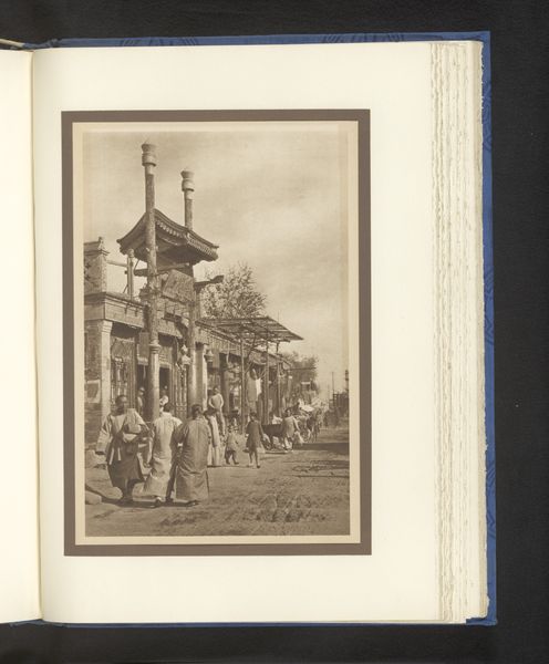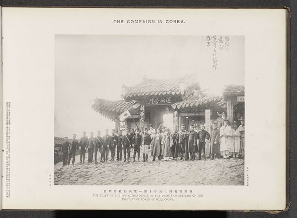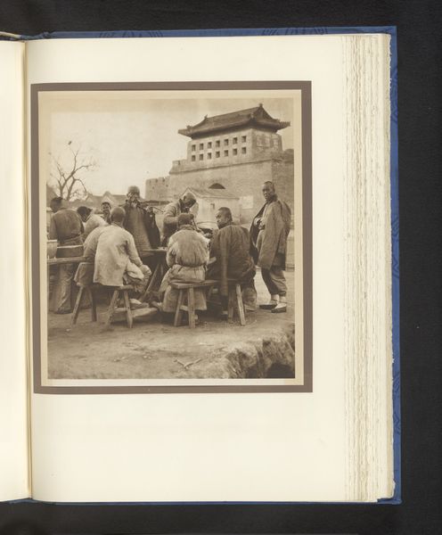 Curator: Let’s delve into this compelling gelatin-silver print, believed to be from 1894, titled "Giving food to the Chinese poor in front of the gate of the late governor's office." The image depicts what appears to be a food distribution in front of a traditional building. What strikes you first? Editor: The raw, documentary feel. It’s all about the social act, the material exchange of food and how that gets managed at this place of government. You can almost feel the weight of those bowls and packages. Curator: Indeed. Considering the historical context, potentially during a time of famine or hardship, this image speaks volumes about social inequalities and power structures. The composition positions the official building in the background, silently witnessing the event. How do you see the roles of those depicted in the image? Editor: It feels carefully staged, though presented as realism. The visible structures are crucial here: bowls, cloth sacks, the architecture and quality of clothing which reveal levels of lack or access to materials for daily life and the distribution of necessities. There are different social roles— servers, guards— and levels of poverty, that the material realities powerfully communicate here. Curator: Precisely. I also interpret this as a very critical gaze at late 19th-century philanthropy and power, because the very act of capturing the image is a choice about which realities become art or spectacle, so there is an ethical dimension worth discussing further. The work makes one contemplate the visual vocabulary of poverty and visibility and think critically about historical responsibility to care and advocate, despite obvious divisions of labor and capital. Editor: This focus on distribution reveals more when considering the location being 'the late governor’s office,’ almost implying a shift or potential vacuum of resources. This location underscores my initial emphasis about access, the building, and even in this representation. Curator: Definitely. It raises questions about governance, access to food resources, social justice and perhaps even what constitutes ethical photography, especially regarding class dynamics. Editor: Considering all, its strength resides in its capacity to show and remind about complex systems which surround even simplest material processes such as donation or help. Curator: I agree completely. It’s a stark reminder of the interweaving threads of culture, politics, and materiality that can inform social dynamics.