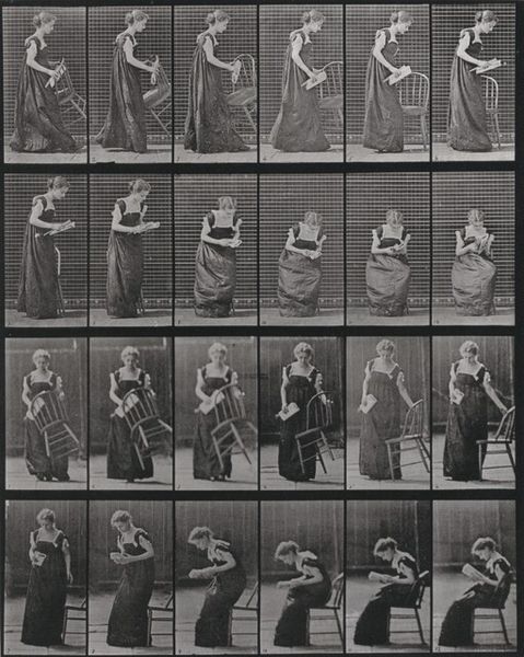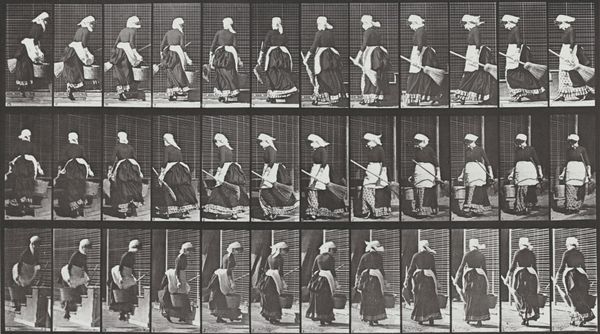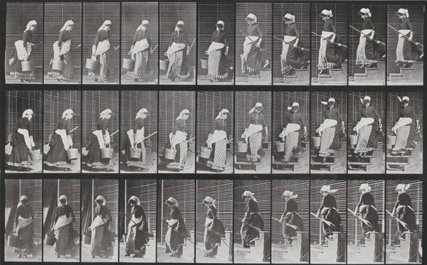 Eadweard Muybridge created this series of photographs, entitled Animal Locomotion, between 1872 and 1885, using a battery of cameras to capture successive phases of movement. The photographic process itself is key here. The gelatin silver print, a relatively new technology at the time, allowed for mass reproduction and distribution of images. This was critical for Muybridge's project, which aimed to scientifically catalog movement. The very act of freezing motion through photography offered a new way of seeing and understanding the body. Consider the labor involved: setting up the cameras, developing the prints, and meticulously arranging them in sequences. It reflects a modern, almost industrial approach to art-making. Muybridge wasn't just creating images; he was producing data. This project challenged traditional notions of the artist as a solitary genius, and shows the intersection of art, science, and the burgeoning industrial age.