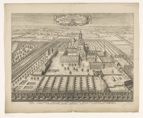 This is an etching of Gezicht op de Priorij van Zevenborren or View of the Priory of Zevenborren, made by an anonymous artist. In this bird's-eye view, we see the Zevenborren Priory, a monastery, nestled in a carefully cultivated landscape. During the time this image was made, monasteries were not only religious centers but also significant landowners and economic entities. The architecture and landscaping reflect a vision of order, control, and a certain kind of utopia, separate from the outside world. Consider the implications of such meticulously planned spaces. Who had access to this place, and who was excluded? How did the inhabitants experience the grounds? The very act of mapping and representing this space suggests an assertion of power and a desire to document and preserve a particular way of life. As you consider this image, reflect on the monastic communities that existed in these spaces and the balance between spiritual contemplation and temporal power that they embodied.