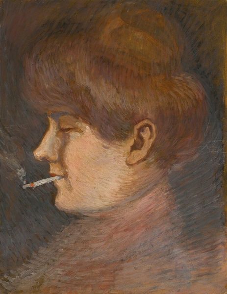 Editor: Here we have Peder Severin Krøyer's oil painting from 1883, a portrait of Eilif Peterssen. I'm struck by its intimate scale and how the brushstrokes almost feel unfinished, like a fleeting glimpse. What kind of a dialogue can we create between today's socio-political context and what was happening in the world that informed Krøyer's style? Curator: The sketch-like quality, combined with its impressionistic influences, invite us to consider the politics of representation itself. Krøyer was part of the Skagen Painters, a community of artists grappling with national identity in a changing Europe. This portrait isn't just a likeness; it’s a statement. How might portraying Peterssen, another artist within their circle, challenge or reinforce the art world's power structures at the time? Editor: That’s a great point. It does feel almost subversive. Was Krøyer intentionally questioning academic portraiture by painting Peterssen with such apparent informality? Curator: Absolutely. The lack of idealization, combined with its casual intimacy, challenges the traditional, often highly class-conscious, portrait commissions of the time. Can we interpret the seemingly unfinished style as a form of resistance against established artistic norms, mirroring broader societal shifts? Do you think, in this act, he might be giving visibility to a certain creative identity, different from those that society deemed prominent at that moment? Editor: It’s compelling to see it as an act of claiming visibility. Looking closer, it feels as if the painting embodies both respect and challenge to conventional portraiture. Curator: Yes, and consider the intersectionality: class, artistic circles, and the burgeoning modern art movement all coalesce in this one image, raising questions about whose stories are told, and how. Considering those historical and social forces definitely influences my understanding of this portrait now. Editor: I hadn't initially considered the painting in relation to those forces, but I realize how understanding Krøyer’s social context and choices as an artist enriches the viewing experience. Thanks.