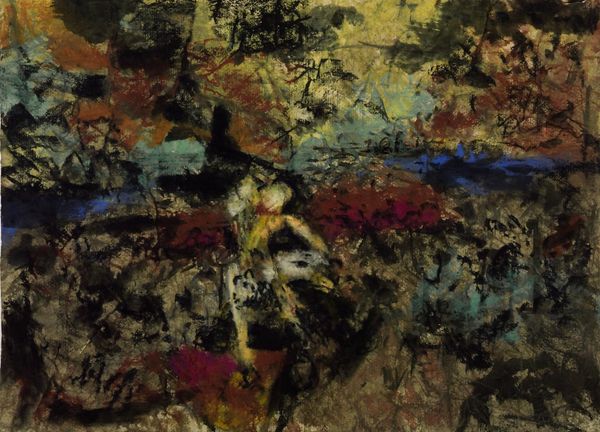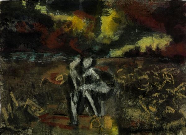 Curator: Standing before us is Enrico Baj’s 1956 mixed-media work, “Two Children in the Nuclear Night.” Editor: My initial reaction is unease, bordering on terror. The figures appear spectral against that lurid, fiery background. It speaks volumes about post-war anxieties. Curator: Yes, and look at how Baj uses abstract expressionist techniques here. The frantic brushstrokes and the way the dark pigments are splattered create a visceral sense of chaos and dread, reflecting the nuclear paranoia of the time. Notice too the grotesque innocence with the stick-like children figures holding out their hands. Editor: Those innocent figures juxtaposed against the potential apocalypse makes a strong anti-war statement, doesn't it? The symbolism feels heavily loaded: lost innocence in a world threatening self-destruction, it reflects a common reaction to post-war trauma. Are these meant to represent every child in the world or some more specific symbolism. Curator: They're archetypal children, their gestures primal, reaching, as humanity forever searching for hope. The entire picture resonates as a kind of a dark fairy tale; one that cautions of possible realities. It serves as an apocalyptic symbol which becomes further evident when analyzing what the children could actually see, the materials the world is now formed from. Editor: And that speaks to Baj's activist spirit, right? He’s not just painting a picture; he’s issuing a stark warning. Art as a tool for social commentary, using those universal symbols of childhood to really land the emotional blow. He has created an emblem that warns humanity that we might destroy it all for short-term material gain. Curator: Precisely, tapping into collective fears and using childhood and its symbolic relation to a hopeful future only amplifies the painting’s significance and lasting resonance. He has created symbols, a warning against technology without awareness. Editor: Thinking about this piece in our contemporary world, still living under the shadow of potential self-destruction with various other forms of climate change to war… It has retained every ounce of its urgent message. Curator: Agreed. Baj's grim fairy tale still resonates with cautionary symbolism about an unstable future. The symbols presented will live forever as a response to his work as an activist, in this piece specifically as one trying to show the damage from nuclear fall-out and technological advancement.