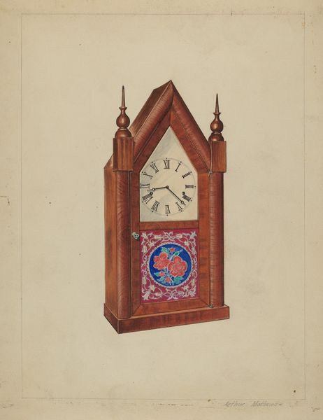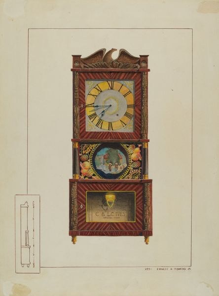 This image of a clock was rendered by Dorothea A. Farrington with what looks like watercolor, and it’s got this lovely, folksy vibe. I really love how it kind of vibrates on the paper, the way she’s built up the image from small strokes. There's something about the texture that’s really appealing, especially how the wood grain is suggested with these light and dark lines. I also love how she includes those landscape details in the panels. The way Farrington handles the trees, those little dots of green, it's almost pointillist! And the eagle up top adds this touch of Americana. It all feels so intuitive. Farrington has a lot of paintings in this mode, a world rendered through the loving hand. This clock reminds me of a Joseph Yoakum drawing, in its dreamlike vision, and how it feels so deeply personal. It is not a painting that is trying to show you something you already know.
