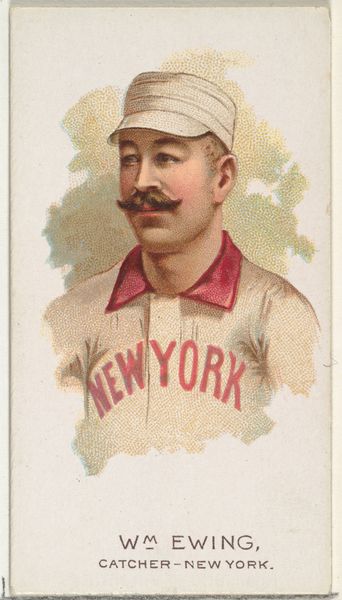 Editor: This is a baseball card of Norman "Deacon" Elberfeld, printed by the American Tobacco Company sometime between 1909 and 1911. I’m immediately struck by its simplicity. It's almost iconic in its straightforwardness, especially with the flat red background. What do you see in this piece? Curator: It’s fascinating how seemingly simple images like this carry so much cultural weight. Consider the baseball card itself, a tiny rectangle invested with enormous emotional value. What does this image of Elberfeld, in his New York jersey, tell us about early 20th century ideas of celebrity, sport, and even national identity? Editor: Well, it's a very direct image, it’s not abstract, like you see with much of the modern art we've been discussing in class. Do you think people at the time would’ve analyzed it in similar ways to today? Curator: Absolutely, in some ways! Early photographic images had this aura of authenticity. The picture promises a kind of truth. It also touches on our shared mythology: sports heroes represent admirable values, physical prowess, and even patriotism. That block of red also screams, doesn’t it? Is it energy? Power? Or just the easiest colour to print? It would have drawn the eye in a shop display of tobacco. Editor: It makes sense when you mention advertising. Tobacco and baseball. Both marketed to everyone, practically a national symbol in their own right. Now that I think of it, how were baseball cards even distributed at this time? Curator: They came inside cigarette packs, so were immediately collectible items! What a memory capsule of not just sport, but capitalism as well! The act of collecting itself is a potent ritual. Editor: This card isn't just about Elberfeld, then; it's like a time capsule holding so many ideas together. Thanks! Curator: Indeed! By studying such images closely, we come to a better understanding of shared desires and aspirations of an entire culture.