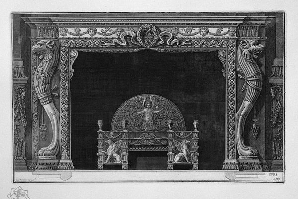 Editor: This is Giovanni Battista Piranesi’s "Fireplace: in the frieze rython to two horse heads, hips 4 caryatids", a drawing or engraving. I am really struck by the level of detail in the rendering, the ornamentation is quite astonishing. What's your take? Curator: This drawing offers insight into the aspirations of 18th-century European society and its fascination with antiquity. Think of Piranesi not just as an artist, but as a public intellectual. How might this fireplace design speak to the growing influence of Neoclassicism and its role in shaping cultural identity? Editor: So it’s more than just interior design? I guess I see the classical references – the caryatids, the horse heads – but how does that translate to "cultural identity?" Curator: Exactly. Consider the audience. This fireplace wasn't meant for just anyone. It was designed for the wealthy elite. These symbols allude to their cultivated taste, their education, their supposed connection to the glory of the past, Roman virtues. The fireplace becomes a stage for enacting and solidifying power through visual rhetoric. How does this image participate in, or perhaps challenge, that rhetoric? Editor: I suppose the sheer volume of detail almost feels like an overload of the imagery… a little heavy-handed. Like, "look how cultured I am!" Is that a criticism or a celebration? Curator: It is both! That tension is central to understanding its historical impact. It speaks to both the possibilities and the contradictions inherent in the public display of knowledge and taste during this period. Editor: It’s interesting to think about a fireplace as a tool of social commentary. I was just focused on the decoration! Curator: And the decoration is, in itself, a potent form of social commentary! The fusion of art, architecture, and social signaling here, creates a very compelling snapshot. Editor: Well, now I see it with entirely new eyes. I am now wondering if anything has changed today, with people still flaunting their wealth and connections through carefully curated designs!
