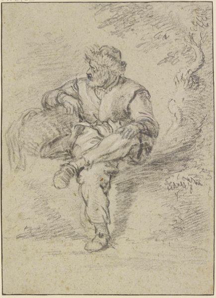 "A Young Man Seated on the Ground" is a drawing by Jan Miel, created sometime between 1634 and 1664, using black and white chalk on paper. Miel was known for his genre scenes depicting Roman street life, often featuring the poor and working class. In this drawing, we see a young man in what appears to be a moment of reflection or rest. Consider the act of sitting on the ground; it suggests a temporary pause, a break from labor, or perhaps a lack of higher status. The way he is looking up and away might indicate longing or hope. What does it mean to consider the male figure with tenderness, rather than the traditional heroic ideal? Miel does not overly romanticize his subject, allowing for an honest portrayal of a young working-class man’s existence in 17th-century Rome. This piece prompts us to reflect on the narratives we construct around labor, class, and the individual human experience.