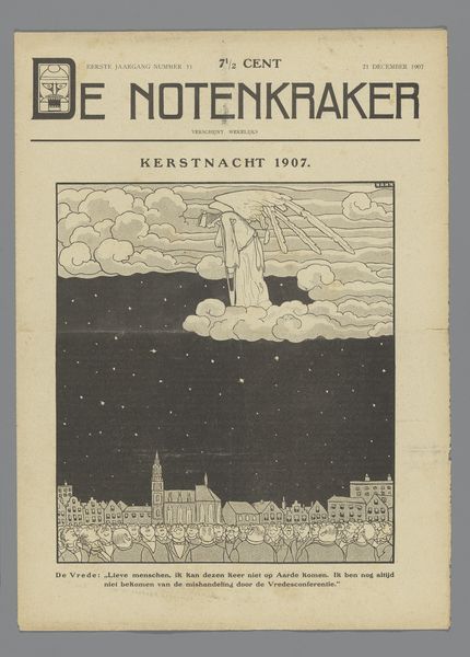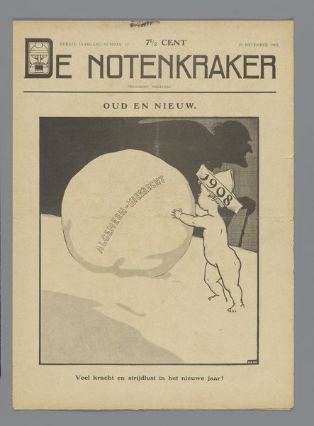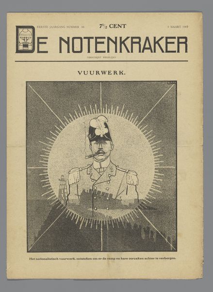Curator: Let's take a moment to examine this compelling piece from potentially between 1907 and 1928 titled "De notenkraker," attributed to Albert (I) Hahn. This work utilizes print and graphic art techniques, resulting in a striking image rendered on paper. What's your initial reaction? Editor: It's visceral. That nutcracker, it looks like some monstrous machine, devouring what appears to be… a person’s head? The scale and black and white drawing emphasize a sense of industrial, consuming force. Curator: Precisely. This imagery ties into early 20th-century social critiques of capitalism. Note the figures in the background, seeming to flee in terror. Hahn often employed symbolism in his pieces to make sharp political statements. The magazine "De Notenkraker" was itself known for satirical illustrations, using art to advocate for social change. This issue being early, potentially the first year, one can gather this might represent a turning point. Editor: I'm curious about the actual printing process. You see how the thick, bold lines define the nutcracker. Consider the labour involved in creating this poster to reach a mass audience. What materials are employed and how do those material realities affect and contribute to the message and the access? I wonder if cheap materials correlate with accessible politics. Curator: Absolutely. The means of reproduction were crucial to its impact. Hahn used his artistic skills as a form of activism, challenging societal norms and power structures. It seems fitting that his art makes its way to a much wider audience than its original era allowed. His commentary rings clear to audiences past and present who resist tyranny in all forms. Editor: It leaves me thinking about the physical act of creating art, then mass production, versus the subjects that the art displays. So much toil in bringing something critical of toil to a large audience… Curator: I find it especially powerful considering it makes you, the viewer, consider the material itself while simultaneously recognizing its ties to class struggles throughout time. Editor: It’s an artwork that asks critical questions about art production as social practice even as it delivers such strong imagery. Thank you for bringing this historical moment alive!