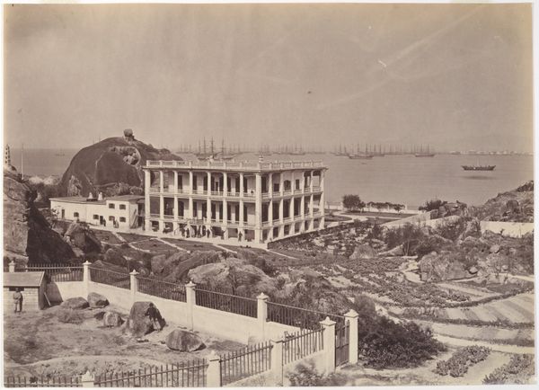 John Thomson captured this image of Rak-Chui opposite Swatow using photography, a medium that was rapidly evolving in the 19th century. Notice the photograph’s composition, sharply divided between the natural and the built environment. Boulders in the foreground lead the eye towards a grand, two-story building. The structure, with its rigid lines and repetitive architectural elements, stands in stark contrast to the organic forms of the landscape. This contrast isn't merely visual. It speaks to a broader theme of the era: the imposition of order upon nature. Thomson, through his choice of perspective and framing, emphasizes the relationship between human intervention and the unaltered world. The photograph operates as a semiotic system; the building could be interpreted as a signifier of colonial presence, altering the landscape. Photography, in itself, further complicates notions of representation, objectivity, and the power of the observer. What are the cultural codes embedded in this colonial gaze?