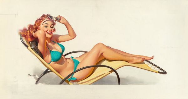 This is an original pin-up illustration by Haddon Hubbard Sundblom, likely made for the Shaw-Barton Calendar Company. Sundblom's work often reflected an idealized vision of American life, deeply influenced by the social norms of the time. Consider the role of women in the mid-20th century. This image presents a carefully constructed fantasy, where the woman’s sexuality is both on display and carefully managed. The revealing dress, the slipped stocking, and the coy smile are all carefully arranged to titillate, yet within the bounds of what was considered acceptable. How does the presence of the dog alter your perception? It is not a wild animal, but a domesticated one. The natural world is tamed. These images were pervasive in the American visual landscape, shaping desires and expectations of femininity. Sundblom’s illustration embodies the tension between the repression and expression of female sexuality. The painting is a window into a specific historical moment.