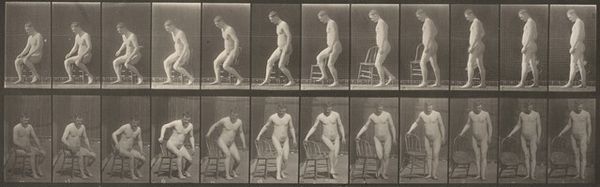 Curator: Here we have "Plate Number 202. Dropping and lifting a handkerchief," a study in motion created by Eadweard Muybridge in 1887. Editor: My initial reaction is one of scientific detachment, strangely combined with a rather unsettling feeling of being observed. The grid of images feels very clinical. Curator: Indeed, Muybridge was deeply invested in the scientific observation of motion, as an extension of the artistic goal to more accurately represent anatomy. He employed a series of cameras triggered in sequence to capture these discrete phases of movement. In the latter 19th century, this technology offered a new way of seeing, influencing both art and science. Editor: The dropping and lifting of the handkerchief itself is a curious, almost theatrical motif. The woman's repeated actions draw attention not just to movement, but also to the mundane transformed into something symbolic by the camera's gaze. What is the cultural weight of such actions captured, catalogued? Is there an intended message? Curator: It speaks to a cultural fascination with categorizing and understanding the human form and its capabilities in an age grappling with the rise of industry and ideas of progress. He hoped to provide scientific information but did get embroiled in some court cases based around morality because of these very images. Editor: Yes. Thinkers might perceive that the nude figure drops or gathers an item of cloth that acts as the forgotten fabric of propriety—dropped or gathered under the clinical stare of progress? Curator: That's a fascinating point. Consider also the framing itself. The individual frames isolate the woman’s body and imply a scientific objectification which, of course, was hugely contentious at the time, when images like these first came to prominence. Editor: An enduring set of associations arises: that of surveillance, scientific scrutiny, and the complexities surrounding the human body as an object of both study and spectacle. This artwork gives an intriguing visual paradox for continued pondering, definitely. Curator: Absolutely, it's a window into a pivotal moment in our cultural history.