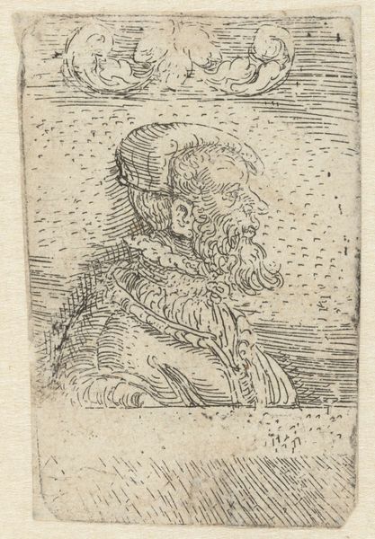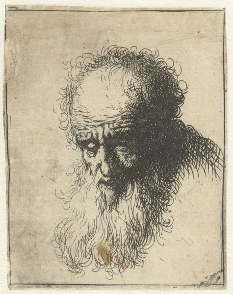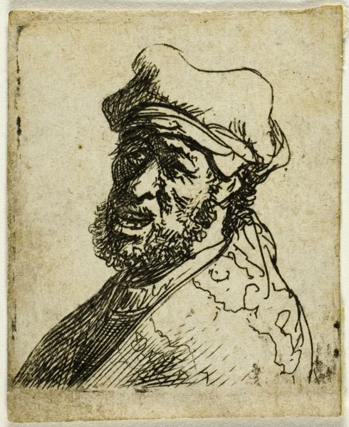 Curator: Oh, this little fellow has stories etched all over his face. Look at the hatching—a furious, beautiful kind of mess. Editor: Indeed. Here we have an etching with ink, “Buste van een man”—"Bust of a Man"—currently held at the Rijksmuseum. It's attributed to an anonymous artist, dating somewhere between 1630 and 1700, which places it firmly in the Baroque era. Curator: Baroque, yes, but stripped down. He's a riot of textures crammed into this tiny square! His ruffled collar practically vibrating. You know, the lack of definitive form, paradoxically, gives him immense presence. A sense of lived-in experience that radiates outwards. I wonder, did this exist as some portrait? A likeness? Editor: Portraits during that period often conveyed status. Etchings made images more widely available. Though anonymous, the subject's clothing--the cap, the collar-- suggests a man of some means. He presents in profile, but avoids the tropes of Baroque extravagance we know. A man looking forward? Maybe that tells us something too. Curator: Forward indeed. I see resilience there, wouldn't you say? The weight of the world sitting right there on the corner of his eye, transformed into art. It feels utterly contemporary. It seems an echo of those forgotten souls, those lives etched onto the social margins of history, or a whisper of history speaking plainly in our minds. I'm drawn back into that world so long ago, in an instant! Editor: Yes. Its anonymity pushes the focus towards larger social questions. It’s the power dynamics inherent in who gets remembered and how. And here we have a portrait with a missing signature which invites reflections on artistic labour and how such men occupied complex positions inside evolving early-modern markets for art. He invites us to look for more answers. Curator: I agree completely, these answers we’re looking for give insight and beauty. Editor: Precisely, so well articulated!