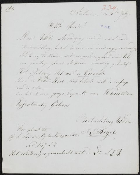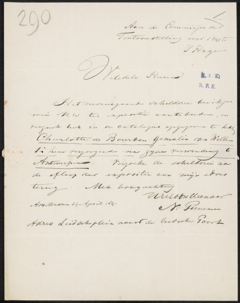 This is Wouter Verschuur’s “Brief aan de commissie van de Tentoonstelling van Levende Meesters in Den Haag”. The letter's visual impact hinges on its linear elements. The artist’s hand dances across the page, creating a delicate balance between legibility and aesthetic form. The lines, varying in thickness and pressure, structure the space, dividing it into textual blocks, each with its own rhythm. The pale backdrop contrasts with the dark ink. This starkness amplifies the linear structure of the script. The letter is not just a mode of communication, but an exploration of semiotics. The arrangement of words, signatures, and addresses contribute to the narrative. The artist manipulates the viewer's engagement through written form and placement. Note the signature. How does its placement at the letter’s close function beyond mere identification? It’s a performative declaration. The very act of signing transforms the document into a statement of intent. The letter becomes an artifact, inviting us to consider its place within the dialogues of its time.