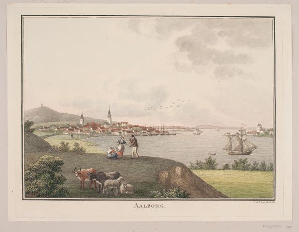 Editor: This is "Gezicht op Koblenz," a watercolor print from after 1820, housed at the Rijksmuseum, artist is unknown. I’m struck by how calm it feels, the gentle river and the people relaxing on the hillside. What do you see in this piece? Curator: Beyond the serenity, I see layers of meaning embedded within the familiar tropes of Romantic landscape. Notice how the artist contrasts the organic curves of the land with the geometric precision of the city. How might that relate to larger anxieties during the early industrial era? Editor: That contrast is interesting! It highlights the tension between nature and industrial growth. Curator: Exactly. The imposing fortress overlooking the city is not just a scenic element. Fortresses often act as powerful symbols of authority, defense, and even a kind of "civilized" order imposed upon the natural world. Consider the individuals scattered in the foreground, too. Editor: They seem detached from the city, almost like observers. Curator: Indeed. Perhaps the artist meant to emphasize a longing for simpler times. It's the romantic gaze in full swing, yearning for the pastoral while standing at the precipice of modern life. Have you noticed how the church dominates the skyline, a religious iconography amid an unfolding secular landscape? Editor: That’s a great point – it does feel like faith is being presented in counterpoint to civic life. The enduring symbolic power, I see it. Curator: This artwork certainly makes one consider how visual elements echo our cultural memory and anticipate anxieties of the future. Editor: Definitely given me a new perspective! I learned to see beyond the surface of pretty landscapes.