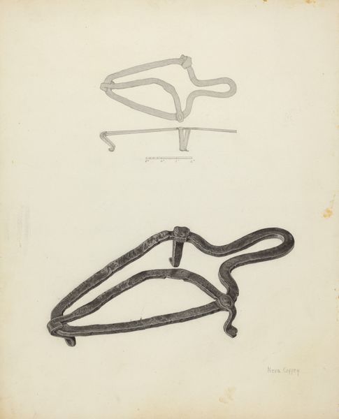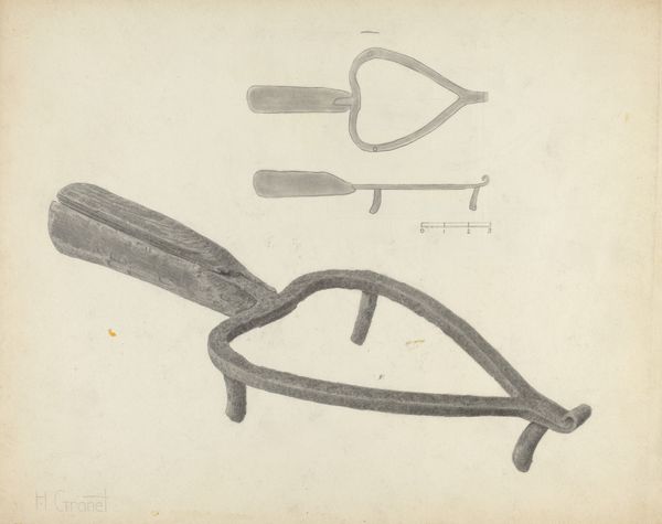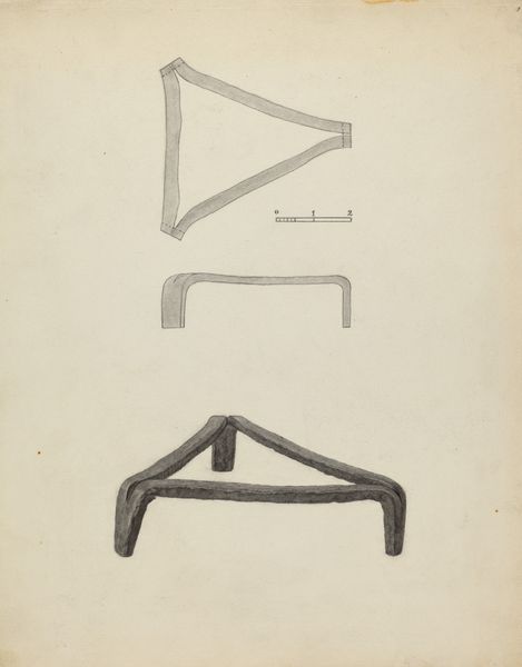 Curator: This graphite and pencil drawing, made circa 1938 by Charles Garjian, depicts a trivet. Editor: It’s stark, almost industrial, yet there's a fragility in the lines, a tenderness conveyed by the graphite medium that softens the object. Curator: Indeed. Look at how Garjian meticulously renders three views of the trivet on the paper: a detailed, shadowed close-up contrasted with lighter, schematic renderings above. It reflects the artist’s concern for utility as much as form. The scale markings also lend the air of design documentation, of practical manufacture. Editor: Yes, this piece is so revealing about design processes and objectification of everyday functional items. One is tempted to consider where it might have been exhibited and whom it may have been created for. Was Garjian's audience domestic consumers or prospective manufacturing entities, who were more familiar with design plans than abstract drawings? Curator: Excellent question. I imagine a range of audiences in pre-war America would find themselves reflected in a domestic object rendered in such meticulous detail. Was Garjian thinking about domestic workers for whom the trivet would have held functional value, and the aspiring upper classes who wanted domestic scenescapes with functional objects? Editor: The dark graphite used for one rendering and pale shade in the others draws our focus to the act of labour and manufacturing—it emphasizes the weight, texture, and physicality of the trivet, perhaps highlighting shifts in American material culture at the time. The artist really asks us to question the politics of depicting utilitarian, manufactured goods. Curator: Well, this object, presented via these different rendering choices, forces us to consider a nexus between art and industry that questions how everyday things obtain value—and what constitutes “art” versus merely craft or product. Editor: I agree. It shows that design is far more than an afterthought; instead it occupies a key node of artistic, societal, and historical intersection.