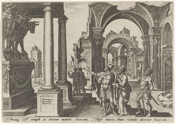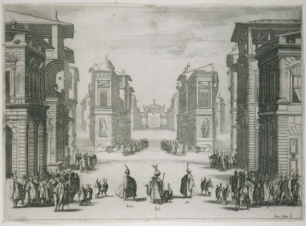 Editor: This is "Heerserpaar met hun zoon in een straat" – "Ruling Couple with their Son in a Street" – a Baroque engraving by Jan van Ossenbeeck, dating back to somewhere between 1663 and 1674. The architecture dominates the scene, creating a grand, almost theatrical feel, and I wonder, what are we meant to feel looking at this? Curator: The rigid structure evokes a carefully constructed sense of authority and order. But it's equally important to ask *who* is this order for, and at whose expense is this grandeur constructed? This ruling family walks in the foreground. But aren't they also dwarfed by these imposing structures? Consider the purpose of this print. Was it meant to celebrate authority, or perhaps even, subtly, question its overreach? Editor: I hadn't thought about it that way. It feels like they are parading, to flaunt their richness. Curator: Exactly! It showcases power, yes. But think about how prints like these circulated. They were commodities, consumed by a rising merchant class also vying for power. Was Ossenbeeck critiquing the established order, hinting at its potential fragility in the face of new social forces? Consider the theatrical perspective; isn't the city a stage upon which social roles are being performed? Editor: So it's less a straightforward celebration and more a complex commentary on power dynamics in that society? Curator: Precisely! The artist is engaging in a dialogue about power, privilege, and the evolving social landscape of the 17th century. It’s a potent reminder that even seemingly straightforward images are often embedded in broader cultural and political currents. Editor: That's fascinating. It’s made me think a lot more deeply about the print’s place within society. Thank you. Curator: My pleasure, these visual documents help reflect on contemporary narratives that still challenge society today.