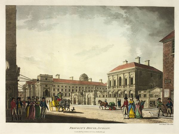 Curator: Here we have a print titled "View of the Patio de los Evangelistas of the Monastery of San Lorenzo de El Escorial." It’s an etching made between 1824 and 1840 by Léon Auguste Asselineau. Editor: My first impression is of profound stillness. It's remarkable how Asselineau captures the weight and imposing geometry of the architecture, even through the medium of print. Curator: Asselineau was working during a time of significant artistic shifts. The rigidity and orderliness you see reflect the influence of neoclassicism, still prevalent in academic circles, despite the burgeoning Romantic movement that valued emotion and the sublime. Editor: The symbolism of enclosed spaces is intriguing. Courtyards often represent a sanctuary, a place of introspection. Here, though, the scale diminishes the individual. The monks seem dwarfed by the architecture, don’t you think? Curator: Precisely. San Lorenzo de El Escorial was built not just as a monastery but as a demonstration of Spanish imperial power under Phillip II. It functions as a monument and asserts state control. The Patio de los Evangelistas, with its religious associations, further reinforces this concept. Editor: Notice how the architectural style almost mimics classical Roman forums or enclosed gathering spaces, speaking volumes about power and influence through architecture. Curator: These architectural choices, of course, had immense political implications. The monastery was a focal point of artistic patronage, with royal authority influencing artistic taste and ideological messaging through buildings and architectural art of this sort. Editor: Ultimately, the visual elements here carry layers of emotional and political weight. It invites us to contemplate power, faith, and even human insignificance within vast symbolic structures. Curator: Reflecting on Asselineau’s etching, we see it serves not only as a depiction but also as a vital document connecting architecture, societal structures, and artistic evolution in the nineteenth century. Editor: Yes, seeing how visual symbols serve to solidify power gives you a great look into Spanish culture at the time.
