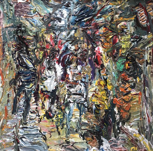 Curator: Alright, let’s get lost in this beauty… Editor: Here we have Nils Dardel’s "Koherde" from 1914, rendered in oil paint. It feels like a hazy dream. A pastoral scene, maybe, but so stylized and… chaotic, almost? What do you see in it? Curator: Chaos, absolutely! But a joyous chaos. I see a dance – a vibrant push and pull between humans, animals, and nature, almost as if he were painting music. See how the figures are almost swallowed by the landscape, they're as important as each other! Notice the layering of brushstrokes; what do you suppose he was aiming for? Editor: An impression, perhaps? A feeling rather than a precise depiction? Curator: Precisely! It’s not just *what* he paints but *how*. He's taking that idea of Romanticism and injecting it with an expressionist's dose of emotional oomph! That lone figure with the hat is a kind of a primal echo of the shepherd in classical landscapes, maybe a nod to Arcadia. It also strikes me of innocence versus the complexities of life, wouldn't you agree? Editor: Definitely! There's an innocence suggested but also an… overwhelming-ness of nature, of life. It's beautiful and maybe a little daunting? Curator: Isn't that what good art does? Holds those complexities? Makes us ask questions? I am certainly in awe of that colorful energy. It whispers possibilities, wouldn’t you agree? Editor: It absolutely does. This painting is much more involved than I initially thought. Curator: Exactly, sometimes art unfolds itself like a well-written riddle.
