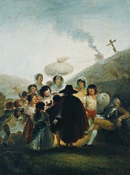 Editor: Here we have "El Marqués De Arco Hermoso Y Su Familia," an oil painting from 1838 by Antonio Cabral Bejarano. The family's placement within this almost idyllic landscape strikes me; they're quite literally grounded in the land, yet also feel somewhat separate from it. What do you see when you consider the materiality of this work and its historical context? Curator: I’m drawn to how the painting foregrounds the labor implied in their leisure. Look closely. The Marquis is a hunter; his clothing and accouterments aren’t just symbols of status, they’re evidence of a specific mode of production—that of land ownership and its implied forms of exploitation. And the garments the family wear are clearly expensive, signifying participation in global textile trade of the era. Editor: That's a fascinating point. So, you're saying the very materials used in creating the scene – from the paint itself to the depicted clothing – highlight their socioeconomic position and reliance on systems of production and consumption. It moves beyond simply being a portrait. Curator: Exactly! And even the act of painting itself becomes a form of labor. Consider the commissioning process, the artist's effort, and the role this portrait played in reinforcing their social standing. It’s a constructed reality built on tangible materials and very specific methods. Are they simply posing, or are they performing the roles they inhabit in society? Editor: It completely reframes how I see it. I was initially thinking of Romantic ideals, but it’s so much more about the materials, work, and the systems in which it was all created! Curator: Precisely! Looking at the piece through a materialist lens offers insight into the processes behind its creation, reflecting not just aesthetic choices, but also the economic and social realities of the time.