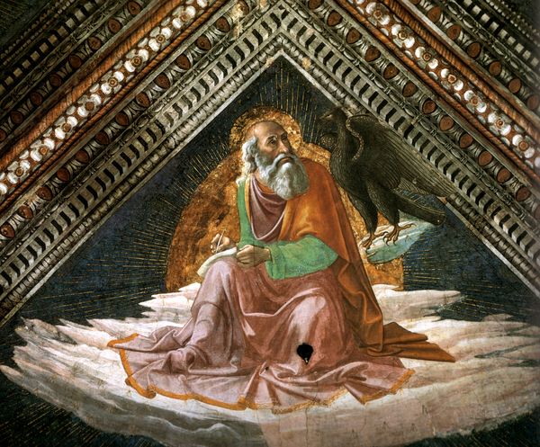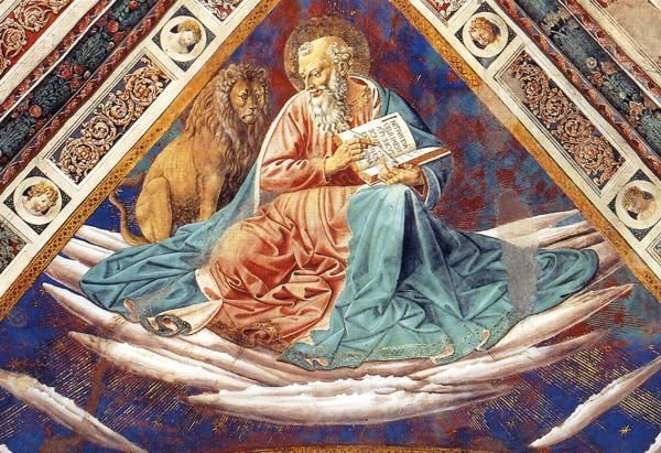 This is a fresco of St. John made by Benozzo Gozzoli in the mid-fifteenth century. Here, the Evangelist is shown hard at work, writing his gospel; next to him is his symbolic animal, the eagle. We might consider how different viewers would understand the painting. For a devout Christian in fifteenth-century Italy, this image might have functioned as an inspiration for prayer and contemplation. But it also had a public role: in representing the Evangelist, Gozzoli helped the Church reinforce its authority. For us, this image raises questions about the social and institutional roles of art. What does it mean to see religious figures framed by these elaborate decorations? How does the setting affect our understanding of St. John? What does this image tell us about the relationship between art, religion, and power in Renaissance Italy? To answer these questions, we can turn to historical sources such as religious treatises, biographies of artists, and records of patronage. By studying these resources, we can gain a deeper understanding of the social and cultural contexts in which art is created and consumed.