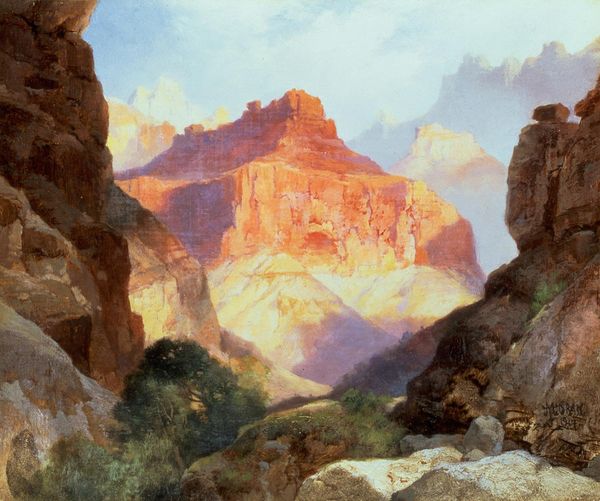 Curator: Samuel Morse, yes, the inventor of the telegraph, created this evocative oil painting, "The Chapel of the Virgin at Subiaco" in 1830, a little known fact for sure! It's now held at the Worcester Art Museum. Editor: Immediately, I'm struck by the almost theatrical light. It really emphasizes the romantic, sublime aspects of the composition—the rugged cliffs, the ruined structure, even the idealized peasants. There's a definite air of staged melancholy. Curator: Indeed. Considering Morse's background, it’s tempting to delve into how this image reflects broader social currents. This work presents a constructed Italian landscape, a romanticized vision likely catering to American audiences yearning for European culture but receiving a heavily filtered view. How do we reconcile this ideal with the reality of production of materials and the potential exploitation inherent in their acquisition? Editor: Fascinating, but I'm drawn more to the interplay of forms here. See how the vertical thrust of that ruined tower mirrors the distant mountain peak? And the artist creates a sophisticated contrast with the soft curves of the figures and the gentle undulation of the hills. It's a clever exercise in visual harmony. Curator: The landscape is indeed quite strategic! Also the material of pigment would not be so readily available to those portrayed in this work! This reflects not just taste but power structures defining both production and reception of artworks at that time. Even the very canvas itself has a history of cultivation, manufacture, and trade… Editor: Yes, but I still find myself responding primarily to the aesthetic impact! It's hard to ignore the sheer beauty of the brushwork and tonal balance. Morse orchestrates this scene beautifully – like arranging notes in a symphony of light. Curator: Perhaps art is always a product, influenced by networks both economic and intellectual, leaving its marks, however faint or deeply submerged? I will give Morse credit that he took such an innovative departure in order to pursue technology, despite what seems to be artistic promise. Editor: Agreed! Analyzing both its aesthetic elements and its relation to manufacturing process adds valuable layers of understanding of artworks! Thank you!