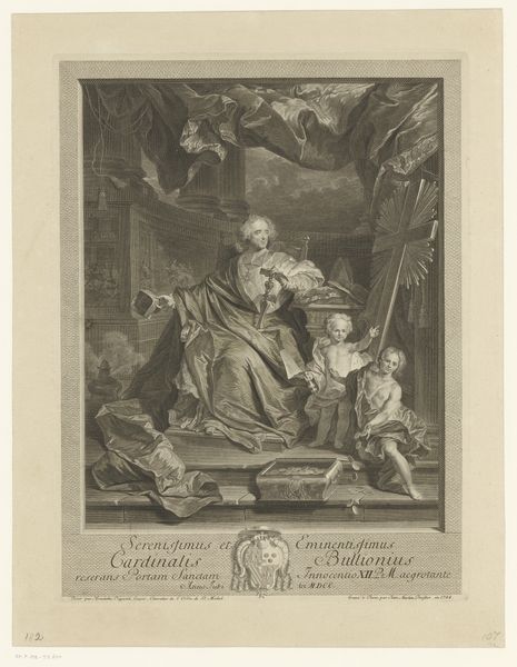 Editor: Here we have "Couple by the Fireside, Watched over by a Dog and an Old Woman," an engraving made by Pierre Adrien Le Beau in 1772. The texture looks intricate with lots of tiny lines. What stands out to me is the tension between the central image of the couple and the almost sinister presence of the old woman observing them from above. How do you interpret this work? Curator: Indeed. Consider how fire functions across cultures. Here, its warmth signifies not just physical comfort, but perhaps passion. The old woman becomes a counterpoint, representing perhaps experience or the watchful gaze of societal expectations. And notice how she's placed *above* the intimate scene; there's a distinct symbolic hierarchy being visualized, isn't there? What feeling do you get from this setup? Editor: It does feel very staged. The way everything is so meticulously arranged suggests it’s not just a simple domestic scene but almost a moral commentary. The dog, too… loyalty perhaps? Curator: Precisely! The dog is the most obvious symbol of fidelity but consider how even seemingly incidental details like the birdcage or the fishing rod above subtly build an allegorical layer, wouldn't you agree? Each object contributing to the scene's overall meaning beyond mere visual representation. The very composition tells the viewer where their values must lie. Editor: I hadn’t thought of it that way, that everyday objects could carry so much symbolic weight. Curator: Visual culture communicates complex ideas across time; through studying these artifacts we develop a greater knowledge of the human experience, wouldn’t you agree? Editor: Absolutely. Looking at it with symbolism in mind, I'm seeing a much richer story being told, of societal expectations and domestic virtue, that's a fresh perspective for me. Curator: And I find myself drawn to the skill it took to compress so many concepts onto this relatively small scene.