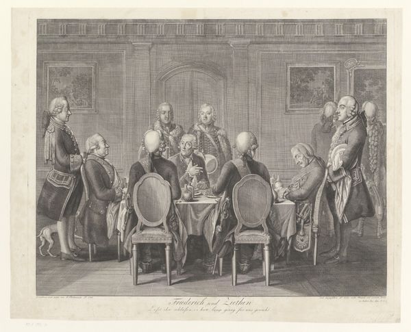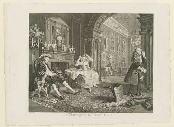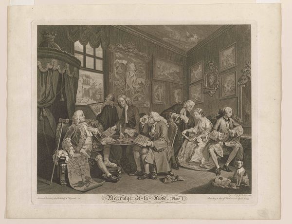Curator: Welcome. We’re looking at the first plate from William Hogarth's series, "Marriage A-la-Mode," created in 1745. This engraving, worked on by Gérard Jean-Baptiste Scotin, offers a sharp commentary on 18th-century aristocratic society. Editor: What strikes me immediately is the overwhelming sense of disquiet despite the luxurious setting. There's a distinct visual tension, isn't there? It's meticulously rendered but feels…off. Curator: Indeed. Note the composition—the arrangement of figures is deliberate. The Earl, stiffly posed, contrasts sharply with the son's more languid posture. What could this opposition suggest? Editor: I see a clash of generations, absolutely. The older man represents established, perhaps decaying, power. While the son…his clothing is more current, yet there's an air of aimlessness. Note, too, the prominence of the family tree. Its roots run deep, its present appears, well, knotted. And these artworks on the wall, revealing debauchery and questionable morals. Curator: Precisely. Hogarth, here, uses the iconography of wealth against itself. The trappings of aristocracy become symbols of moral corruption. Consider the contracts being pored over: marriage as transaction. The entire arrangement reflects not an organic growth but a constructed spectacle. Editor: This spectacle is unsettling. The young bride’s distracted gaze, the lawyer whispering—every element conveys deception. Even the poor, neglected dog mirrors this overall mood. It’s an indictment, presented through meticulous detail and refined line work. Hogarth clearly had something sharp to say about this societal stratum. Curator: Indeed, a devastatingly insightful observation. We have considered just one plate here, which serves as an efficient opening. Its careful formal articulation conveys not merely social commentary but an enduring depiction of human folly. Editor: Absolutely. It’s a visual language still relevant today. Each symbol and interaction whispers of power, manipulation, and the hollow reality behind gilded façades. Powerful!