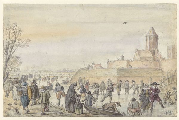 Jacob Cats created this watercolor of ‘Bedrijvigheid op het ijs bij de stadswal van Veere’ in the late 18th century. During this period, the Dutch Republic experienced significant political and economic shifts, influencing artistic expression. This winter scene provides a glimpse into the lives of ordinary people during a time of both hardship and resilience. The frozen landscape becomes a stage for commerce and community, yet it also speaks to the challenges of daily life in a harsh environment. The figures, bundled against the cold, engage in various activities, revealing the resourcefulness required to navigate the season. What stories do you think are contained within these interactions? Do you see this piece as a window into a shared history, reflecting both the collective spirit and the individual experiences of those who lived it?