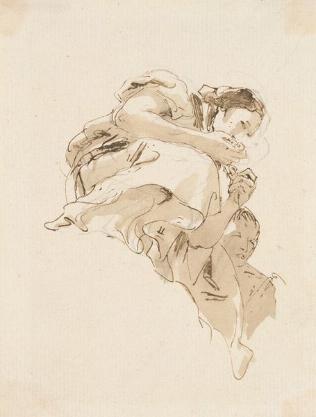 Giovanni Battista Tiepolo rendered this dynamic drawing with pen and brown wash, presenting a flurry of figures and forms that merge classical mythology with baroque dynamism. The composition feels both intentional and spontaneous, a study in controlled chaos. Notice how Tiepolo's fluid lines and contrasting washes create a sense of movement. The human figures and the horse seem to tumble across the page, their forms loosely defined yet full of energy. This deliberate lack of precision invites us to fill in the gaps, engaging our imagination in the act of perception. The drawing challenges fixed meanings through its fragmented and ethereal quality. Rather than a clear narrative, we see a constellation of forms and gestures, prompting a meditation on the ephemeral nature of time and the power of suggestion in art. Tiepolo masterfully employs a semiotic system of signs, where each stroke and shadow contributes to a larger, ambiguous whole. This imbues the work with a timeless quality.