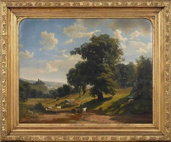 Curator: This is "The Rustic Bridge, Château de Méréville, France," painted around 1785 by Hubert Robert. It’s an oil on canvas. Editor: Well, isn't that just utterly dreamy! I’m immediately struck by how theatrical it feels, almost like a stage set, beckoning you into some pastoral drama. Curator: That's insightful. Robert was deeply influenced by garden design and architecture, translating spatial concepts into symbolic compositions. Bridges, especially, often symbolize transition or connection, here possibly bridging social classes within the aristocratic estate. Editor: That's so interesting! It's the figures though, clustered as they are, almost like ornaments in this designed landscape, that really speak to me. Are they archetypes, meant to play a part in some romantic allegory? Curator: Partly, yes. But it goes further. Notice the asymmetry, and the somewhat dilapidated quality of the bridge itself. Robert often juxtaposed the ideal with the real, suggesting that even the most meticulously crafted environments are subject to time and change. There is melancholy at play in the imperfection. Editor: Ah, ruin and decay, even within this perfect aristocratic construct! It does suggest that lurking within the manicured lawns are darker, messier truths about mortality, about the transience of power. Kind of throws shade on the whole Rococo ideal, doesn’t it? Curator: Absolutely. He utilizes that very tension – the inherent impermanence juxtaposed with the idealized pastoral. He layers on complexity; a dialogue between fleeting moments and the timeless nature of symbolism. Editor: And what about that statue on the left! Almost hidden but commanding the space like some sentinel figure... Do you think that is significant too? Curator: Definitely, these details emphasize the importance of integrating history, mythology, and philosophical meaning into a comprehensive design. Editor: Gosh, this really pulls at something, doesn’t it? This is how an imagined, romantic past stares back at you and whispers about realities. A beautiful façade masking darker undertones, hidden from polite society. Curator: Indeed. Robert invites us to delve beneath the surface of visual harmony and question our own connection to it. Editor: A visual reminder of what time really does to all of us. Thanks for walking me across that bridge; so lovely to spend time with this piece.