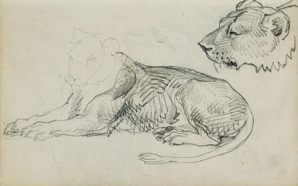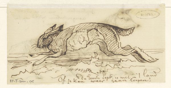 This is a quick study of a hare in pen and brown ink, made by Johannes Tavenraat, a Dutch artist, in the 19th century. Tavenraat captures the animal in mid-leap with swift, energetic strokes, the blank paper creating a sense of light and movement. During the 1800s, the Netherlands was seeing a revival of its artistic traditions, with renewed interest in landscape and genre painting, often focusing on distinctly Dutch subjects. Animal studies like this one were popular, reflecting a broader cultural fascination with the natural world. Tavenraat's work here is not overtly political, but it reflects a certain sensibility of the period. It's through understanding the institutional context of art production, the market for these kinds of images, and the artistic training Tavenraat would have undergone, that we can better appreciate the social conditions that shaped its creation. Research into Dutch art academies and the prevailing aesthetic tastes of the time can offer a deeper understanding of this unassuming drawing.