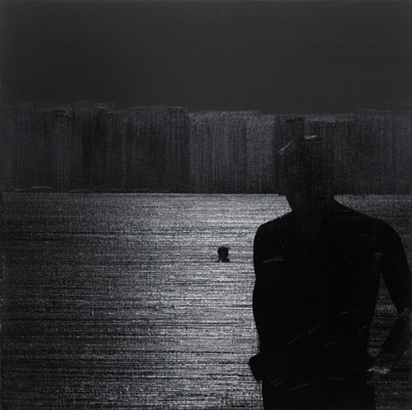Curator: "Eleanor and Barbara, Chicago," a 1953 gelatin silver print by Harry Callahan. There's something so immediately striking about the composition, don't you think? The way the figures emerge from that intense darkness. Editor: It's powerfully evocative, almost biblical in its starkness. That intense contrast of light and shadow...the light seems almost divine, illuminating these two figures against what could easily read as a symbolic abyss. It's more than just a photograph, it’s an allegory. Curator: Callahan often explored very intimate subjects, his wife and daughter, and placing them within, almost abstracted, urban landscapes. There's something undeniably lonely about this image, even with the figures together. Editor: Agreed. Look how isolated they appear. That beam of light almost accentuates the vast darkness surrounding them. And while light traditionally represents hope, here it feels like a stage light, revealing rather than comforting them. Chicago was undergoing enormous changes in the 50s, economically and socially – that anxiety translates into the image's visual language of alienation. Curator: Do you think Callahan intended that sense of anxiety, though? Or was he more concerned with exploring the pure aesthetics of light and form? The photograph feels both deeply personal and remarkably universal. It resonates beyond any one time or place. It seems the mother is guarding her child as they traverse across life, from one point to the next, through shadows cast as symbols. Editor: It is definitely the duality of the 1950's American experience. We shouldn't ignore the historical context: the burgeoning Cold War, the rise of suburbia and nuclear families, also deep undercurrents of fear and conformity that defined much of social interaction during that era. The photo does present the classic Madonna and child theme but shrouds it within a sense of apprehension. Curator: And it is a fascinating point; by emphasizing the negative space and stark tones, Callahan somehow amplifies our understanding. His artistic sensitivity has turned his lens into something revelatory, casting its thematic light far into the future of our human concerns. Editor: Absolutely. Callahan captured not just a mother and child on a Chicago street, but a pivotal cultural mood, giving tangible form to ineffable feelings through symbolic imagery.