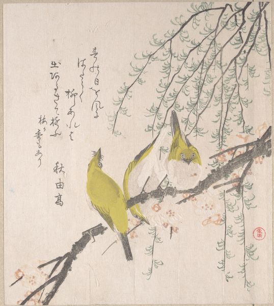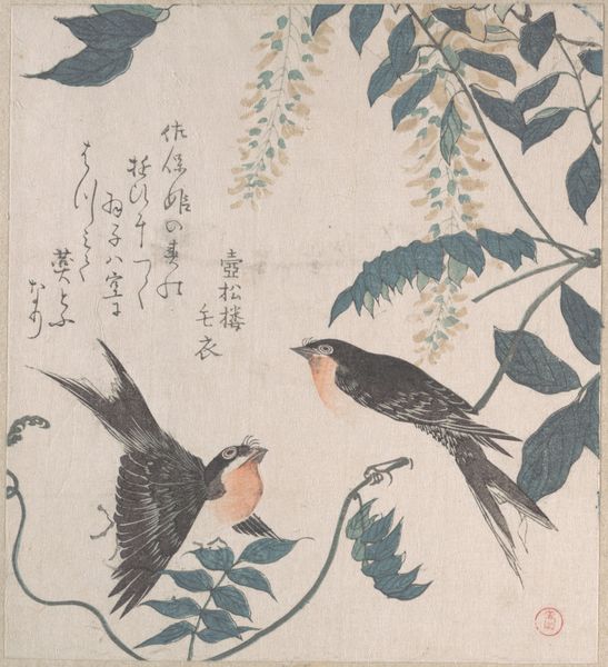 Utagawa Hiroshige created this woodblock print called "Swallows and Wisteria," sometime in the mid-19th century. Its visual impact resides in the contrast between the dynamic, diagonal lines of the wisteria vines and the birds' poised yet energetic forms. The composition is balanced yet asymmetrical, creating a sense of naturalism. The dark blues of the wisteria’s stems and the swallows' feathers anchor the composition, while the cascading wisteria flowers soften the hard lines. Note how Hiroshige uses empty space, a key aspect of the print's aesthetic. The birds, captured in mid-flight, disrupt the static representation, introducing a temporal dimension that invites contemplation. The print subtly destabilizes traditional landscape conventions. The tension between stillness and movement exemplifies how Hiroshige engages with philosophical ideas about nature and time. Through its composition, Hiroshige's print offers a continuous play between representation and abstraction. This reflects a broader artistic concern with capturing fleeting moments. This interplay invites us to reconsider our relationship with the natural world and its ever-changing beauty.