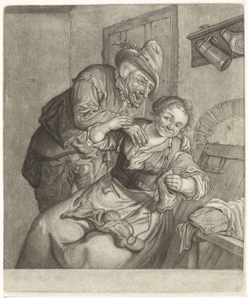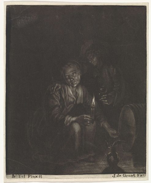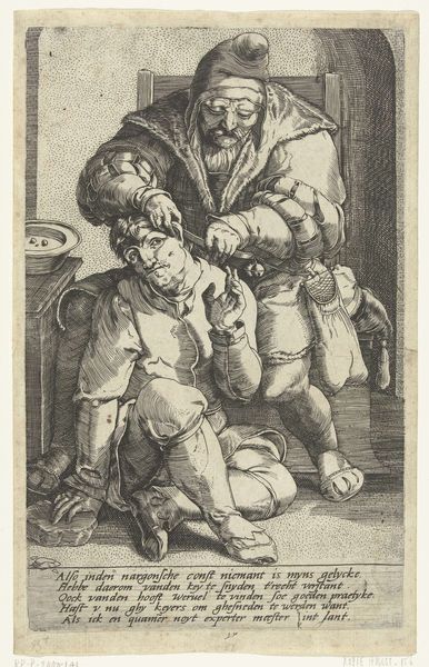 Editor: This print, *Keisnijder*, probably dates sometime between 1650 and 1800. It's an etching, engraving, and drypoint. The overwhelming mood is one of discomfort, if not outright pain. What stories do you think this work has to tell? Curator: Well, at first glance, the visceral expressions are captivating. But beyond that initial reaction, I think it's crucial to consider the broader social implications and question what exactly we are looking at here. Consider how healthcare disparities manifest across class and gender in different eras, which invites questions about access, agency, and vulnerability. Editor: So you're suggesting we look beyond just the immediate scene? Curator: Exactly. Think about the historical context. Who had access to proper medical care? How might this scene reflect broader societal anxieties about health, well-being, and bodily autonomy? Who is inflicting this apparent pain on another? This is where power comes into play and invites a critical conversation of its nature and manifestations. Editor: That’s interesting, because my first instinct was just to think about how unpleasant it must be to get a cyst removed that way! Curator: I understand that initial response. But art can serve as a lens through which we examine not only the past but also our present. Does seeing a print like this make you consider your own experiences or assumptions regarding the current health care system or maybe cultural norms around the experience of feeling unwell and needing care? Editor: Definitely. I'd never considered it beyond the surface level before. Thanks! I'll look at art differently now! Curator: Likewise! Art’s power is in its ability to encourage continual questioning and re-evaluation.