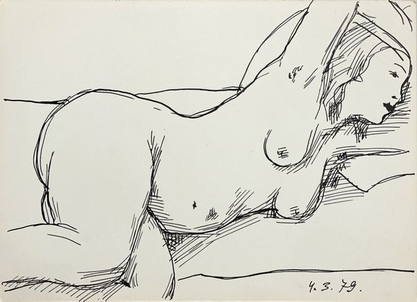 Alexej von Jawlensky made this reclining nude using black ink on blue paper. It's a study in contrasts, right? How the stark black lines define the soft curves of the body, creating a tension that's really engaging. The texture here is all in the application, with delicate lines contrasting with blocks of solid black. Check out how the marks around the figure create both a sense of depth, and also flatten out the space. The ink almost seems to float on the surface. Note the hatching around the head and torso, and how the marks mimic the curve of the body. Jawlensky, like Matisse, whom he knew, was deeply interested in the relationship between line, form, and color. The simplicity of this piece is quite deceptive, when you consider the ideas at play, and the space it opens for our imaginations.