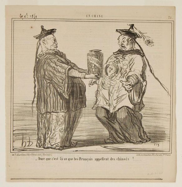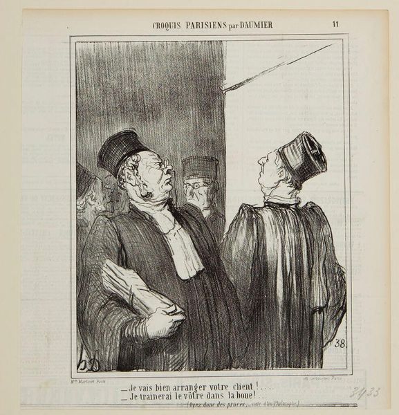 Curator: This is a print by Honoré Daumier, titled "Your Client is a Scoundrel," held here at the Harvard Art Museums. Editor: My first thought is how stark the image is, with the stark black-and-white contrast capturing such a cynical mood. Curator: Indeed. Daumier used lithography to produce multiple copies, making his satirical commentary accessible to a wide audience. The work's materiality underscores its function as social critique. Editor: Notice how the figures and setting are rendered with quick, almost frenzied lines, suggesting corruption and moral decay within the judicial system. It's quite telling. Curator: The composition centers on the two lawyers, emphasizing their power and questionable ethics. It makes one think about the structure of power. Editor: I find it unsettling that the men dine so casually while discussing serious crimes. It speaks volumes about the normalization of injustice within their social circles. Curator: The print's stark contrasts serve not just aesthetic function but also as a material instantiation of Daumier's moral perspective. Editor: It's unsettling how timeless the message remains—a reminder of the systemic issues that persist beyond the artwork’s creation.