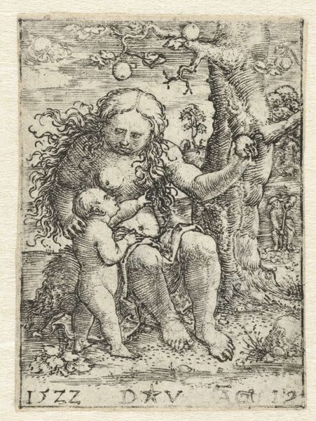 Curator: Here we have "Saturn, plate one from The Seven Planets with the Zodiacs," an engraving from 1539 by Sebald Beham, currently housed at the Art Institute of Chicago. It's rather striking. My initial impression is one of intricate detail contained within a small space. Editor: There’s an undeniably brooding atmosphere to it. It strikes me immediately how Beham captures Saturn’s association with melancholy and the burdens of time. The figure, with his furrowed brow and weary posture, embodies the weight of history, doesn't he? Curator: Absolutely. Saturn, in mythology, is associated with cyclical time, restriction, and even destruction, especially toward his offspring. Note the figure carrying a child, alongside another child near a fountain. This imagery intersects with the patriarchal structures of the time and fears surrounding lineage. Editor: Yes, and look at the engraving technique itself. The dense cross-hatching creates a sense of shadow and depth that accentuates the figure's somber mood. The composition is almost claustrophobic, fitting for Saturn's constricting influence. See how the gaze shifts downward with his bent arm, bringing us lower. Curator: Right, and that very technical skill speaks to the Renaissance preoccupation with both classical learning and its anxieties surrounding tradition, the burdens of the past as well as the perceived need for the abandonment of past traditions and values in favour of a modern future. Editor: Precisely! It’s a stark depiction—quite powerful how he manages to convey the influence of Saturn not just through allegory, but also through the materiality and technical skill evident in this engraving. I'm compelled by his ability to transform metal to express time. Curator: This image speaks to how societal anxieties regarding our responsibilities, generational trauma, the cycle of care, and burdens manifest in cultural works, asking critical questions. I am drawn to it still, because those thematic ideas are as contemporary now as then. Editor: Yes, quite enduring and skillfully rendered. Thank you.