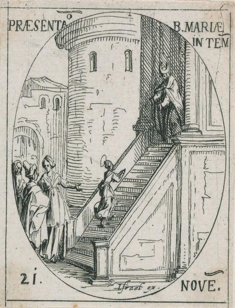 Editor: Here we have Albrecht Altdorfer's woodcut, "The Virgin Entering the Temple." It feels so enclosed, almost claustrophobic. What stands out to you? Curator: I see the representation of prescribed gender roles within religious institutions. Consider the young Virgin Mary: a girl child being ushered into a space of male authority. What power dynamics are at play here? Editor: So, her agency is essentially non-existent? Curator: Precisely. The composition funnels her into a preordained path, devoid of individual choice. The figures looming over her represent the weight of societal expectation. Editor: That reframes my entire understanding. Thank you! Curator: It's crucial to consider these contexts. Art isn't made in a vacuum; it’s reflecting, reinforcing, or resisting the structures around it.