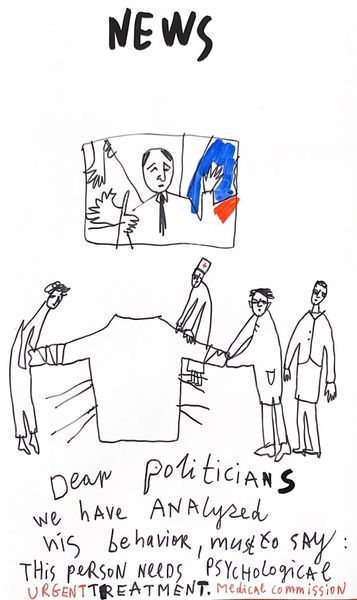 Editor: We’re looking at Alevtyna Kakhidze's “Untitled” drawing from 2022, created with pen and ink on paper. It’s filled with figures and text, almost like a political cartoon. What do you see in this piece, considering its context? Curator: It's impossible to ignore the work's strong socio-political undertones, especially given the date. Kakhidze, being a Ukrainian artist, directly addresses the collective culpability of Russian citizens in the ongoing conflict. How does the artist visualize the connection between individual actions and larger geopolitical events? Editor: I see figures labelled as 'The Artist,' 'The Comedian,' ‘The Singer,’ each seemingly contributing in some way. There's a vertical scale on the side… maybe indicating a level of responsibility? Curator: Exactly. The "degree of fault" seems to be a central theme here. It raises a critical question about individual responsibility within oppressive regimes. Note how national symbols are interspersed: where are the colours of the Russian flag deployed and in what circumstances? What does it tell you about their individual levels of responsibility, or perhaps about different modes of implication? Editor: The Russian flag colours appear on the shoes of a seated man and draped on someone lying down. It gives me a sense of being weighed down or implicated despite perhaps seeming passive. Curator: Precisely. The drawing highlights the complexity of complicity. The style itself, almost childlike in its simplicity, juxtaposes the gravity of the subject matter. Doesn't the direct, unpolished line work force a confrontation with uncomfortable truths? It leaves no room for escapism. What implications do identity politics have in understanding artworks such as this? Editor: It’s eye-opening. The artist compels viewers to question power structures, identity and accountability in times of crisis. Thank you. Curator: It highlights the important role of art in voicing concerns of global socio-political matters and reflecting on collective consciousness during crises. A stark visual representation of a painful reality.