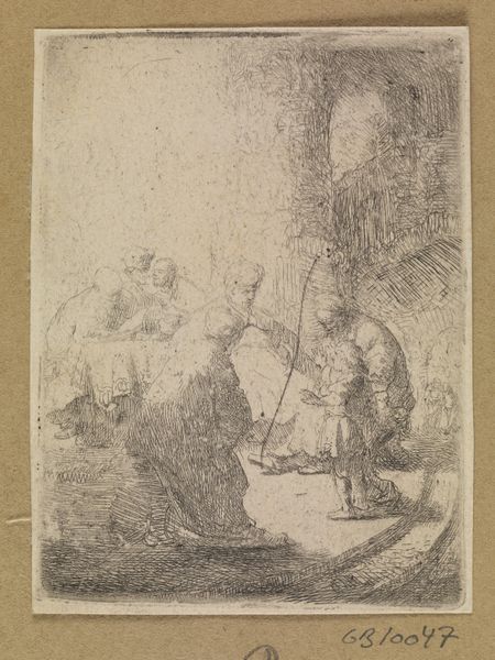 Editor: Here we have Jean-Honoré Fragonard’s “The Supper at Emmaus,” created around 1760, rendered in pencil and chalk on paper. There's something very raw about it, almost unfinished. It feels more like a fleeting impression than a fully realized composition. What strikes you when you look at it? Curator: It's fascinating how Fragonard, associated with Rococo frivolity, engages here with a deeply religious subject. The 'Supper at Emmaus' was often depicted as a moment of grand revelation. How does this sketch challenge or perhaps subvert that tradition, and the expectations of Rococo art in general? Editor: Subvert, how so? Curator: Look at the setting. It’s a domestic space, yet sketched with this quick hand and not really embellished. What do you observe about the role that images of the divine play in a time that is quickly adopting ideas around enlightenment and science? Editor: So you’re suggesting this raw quality might be a conscious choice? A more... relatable interpretation of the sacred? Away from, I don't know, elaborate churches? Curator: Precisely! It asks, perhaps, where can the sacred exist? Rococo became intertwined with the lavish aristocracy in France leading up to the revolution, Fragonard presents it with humility in these tense, early modern environments that seek both luxury and devotion. He frames a very intimate supper to depict an even more intimate scene where recognition of faith is being brought to light. It presents interesting cultural paradoxes doesn’t it? Editor: It certainly does. I came in thinking it was simply unfinished, but it's clearly speaking to much larger themes. Thank you! Curator: It's always rewarding when a sketch reveals as much as a finished piece, or even more. It’s a lens into Fragonard's world!