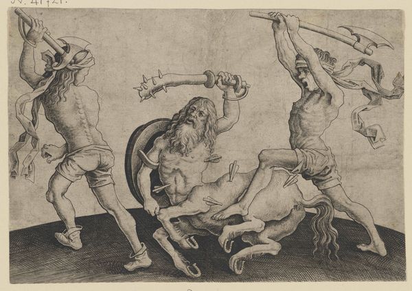 Curator: I find myself both intrigued and slightly unsettled by the swirling energy conveyed in this engraving, "Dance of Fauns and Bacchants." Editor: Yes, it’s incredibly active. There is almost an imbalance because there is a forward motion driving right to left. Note the attention to detail; the artist creates this sense of movement using clear, purposeful lines. Curator: The print dates to 1518 and is attributed to an anonymous artist featured in the *Speculum Romanae Magnificentiae,* a collection documenting the magnificence of ancient Rome and, naturally, displayed in the Metropolitan Museum of Art. The era witnessed rising enthusiasm among elites, notably reflected in collecting ancient artefacts, so this imaginary genre scene gains importance as an allegory. Editor: Those geometric floor tiles underfoot add so much to the perspective. But look more closely at the central female figure, probably a Bacchante. See how her drapery flares, reinforcing the implied motion. The engraving gives volume to her dress so it appears to actually flutter around her body. Curator: Consider what it means to represent these figures. This piece, like many others in the *Speculum,* functions as a kind of cultural advertisement. In showing the bacchanal, with its connotations of revelry and ecstasy, Renaissance society attempted to reclaim this perceived golden age and its freedoms, suggesting a conscious political identity. Editor: True, there's that association. But the dynamism inherent in the composition—that constant pull toward the right and the stark light-dark contrast—gives the figures an urgency. You know, an anxiety. This formal contradiction reflects the moral ambiguities tied to such displays. Curator: That's a wonderful point. The attempt to publicly legitimize displays of power with artistic license inevitably brings those sorts of internal contradictions. A potent snapshot of Renaissance aspirations! Editor: Absolutely! The stark contrast between form and content captures something vital about the era.