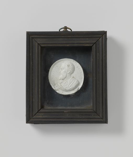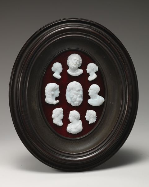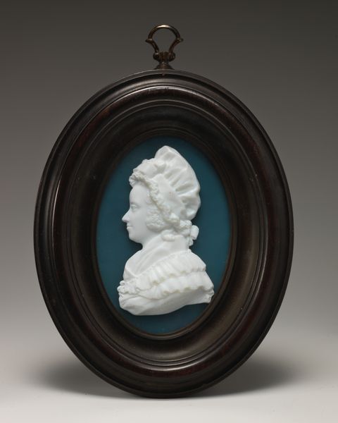 Editor: Here we have a plaque crafted in 1796 by James Tassie, currently housed at the Met. It appears to be a profile portrait, possibly made of marble or a similar material, encased in wood. What can you tell us about this piece? Curator: Looking at Tassie's plaque through a materialist lens draws our attention to the production process itself. Consider the material choices: the selection and carving of the marble-like substance for the portrait against what appears to be a tinted glass backing, then framed with wood. What does the use of readily accessible materials say about its intended audience? Editor: That's interesting. It almost seems like a more democratic form of portraiture, not limited to painting for the elite. Curator: Precisely. Tassie was quite prolific in reproducing these portraits and sculptural reliefs, thus enabling broader access to representations of important figures and artistic styles influenced by neoclassicism. It reflects the social dynamics of the period. Can you see how it diverges from something commissioned by the sitter? Editor: I guess commissioning would imply the agency of the individual, while the mass-produced plaques have less to do with individual status. They are connected to distribution and production on a much wider scale. Curator: Exactly. These weren't just aesthetic objects, they were commodities within a growing market of art consumption. We must ask: what are the social implications of producing images for consumption? It shifts our understanding from simple admiration towards investigation. Editor: That makes me see it in a totally new way. Thank you for pointing out the material and its socioeconomic context! Curator: It is important to look beyond the aesthetic value to discover the processes and social conditions through which art emerges.