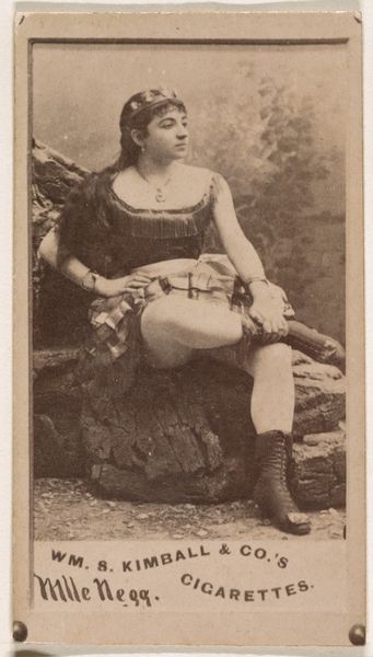 Curator: This is card number 369, part of the "Actors and Actresses" series, produced by W. Duke, Sons & Co. in the 1880s as a cigarette card. Specifically, it features Miss Marie Williams. Editor: Oh, she looks playful! It’s funny, you expect seriousness from portraits of the time, but there’s almost a cheeky sparkle to this, despite the sepia tones. Her outfit reminds me of a slightly undone Peter Pan, doesn’t it? Curator: Exactly! The casual, somewhat unconventional attire, speaks volumes when viewed through the lens of 19th-century societal expectations for women. Consider that these cards were aimed primarily at male consumers. How might the commodification and portrayal of female performers intersect with issues of gender, power, and spectatorship? Editor: Good point. She’s definitely performing. It makes you wonder what was expected of her, both in the theatre and in the marketplace. It's also interesting how these little cards made celebrities accessible, collectible even. Curator: Precisely. We can delve into how this particular card, through its mass distribution, contributes to constructing an image of idealized femininity. It’s not simply a portrait; it’s a piece of marketing, subtly encoding desires and anxieties of the time. Think of it in terms of visibility, representation and consumption. Editor: It feels…complicated, seeing it today. Part charm, part old-timey advertisement…and then the undertones you are pointing out about the objectification. It really does makes you wonder what Miss Marie Williams herself thought about all of this. Curator: Absolutely, it's layered. Examining objects like these cigarette cards provides rich insight into how individuals, especially women, navigated social structures and commodification during the late 19th century. Editor: I still keep coming back to how modern it feels, in a weird way. And makes me really curious about her as a person. Curator: It is fascinating indeed, something that keeps resonating as you spend time considering the interplay between her individuality and the larger economic forces at work in popular culture.