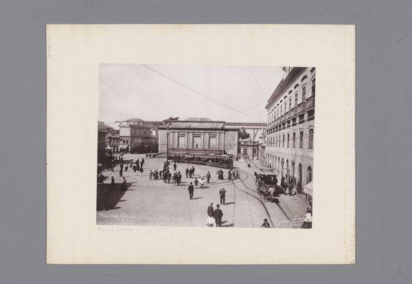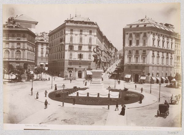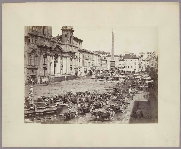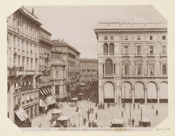 This is an albumen print of Piazza S. Ferdinando in Naples, capturing the Galleria Umberto I and the San Carlo Theatre. The photograph’s sepia tones give a sense of a bygone era. Note the composition: the photographer has framed the scene to emphasize the architectural grandeur of the piazza. The photograph highlights the geometry and symmetry in the building's design, creating a sense of order and stability. The repetitive windows, arches, and columns serve as visual signifiers of classical ideals and the era's aspirations for rationality. The linear perspective creates depth and guides the viewer's eye through the piazza, which is populated with figures and horse-drawn carriages. This image also intersects with broader theoretical ideas about representation and reality. Photography challenges traditional artistic hierarchies and notions of originality by capturing a moment in time with mechanical precision. Consider how the photograph’s form reflects its historical context, capturing the socio-political environment of Naples at this moment in time.