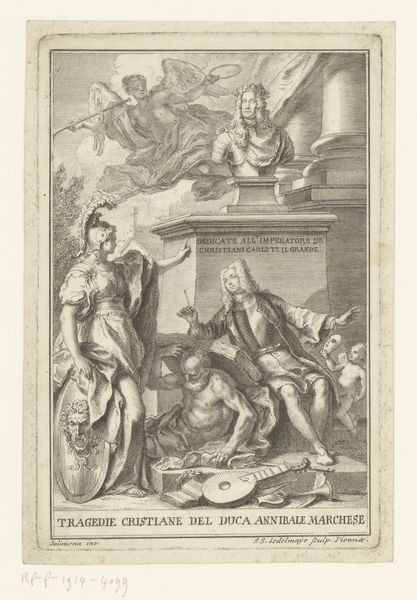 Curator: This print, currently held at the Rijksmuseum, is a portrait of Christiane Augustine Platner, created sometime between 1680 and 1767 by Martin Bernigeroth. It is done in the Baroque style and employs engraving as its technique. Editor: My first impression is how cool the tone is. The stark grayscale palette accentuates every crisp detail and elaborate shape, highlighting the rich engraving lines. It's a striking visual, and a real display of craft. Curator: Absolutely. It's interesting to consider Bernigeroth's role within the established portraiture conventions of his time. Notice how Platner is elevated, quite literally, upon a pedestal, transforming the subject into a symbol of power and virtue. The allegorical figures around the pedestal act as framing devices while also hinting at aspects of the woman's life or virtues that she embodied. Editor: The composition seems really contrived. This makes me think of production of images like this, how artisans probably spent hours, even days or weeks, carving into copperplates to achieve such incredible refinement. Did they intend to immortalize not just the sitter but their work too, elevating this craft? Curator: Engraving allowed for the mass production of images, making portraits like these more accessible. While celebrating an individual, it also disseminates ideals and upholds the social order. Look at the deliberate composition, and the allegorical details such as the female figures; they play an important role in conveying societal expectations and communicating Platner’s status and accomplishments. Editor: The textures here, particularly in the draping fabric, must have required significant skill. Do we know what kind of circulation this work might have had, who was buying prints of portraits back then? It certainly makes you consider the labor involved in these things. Curator: Such prints would have been accessible to a particular segment of society – those with enough affluence. It reinforced a specific socio-economic structure through the circulation and consumption of these portraits. These works really become objects that reinforce class status. Editor: Thinking about it this way offers a whole new viewpoint. Seeing it as more than just "art," instead looking at it as an accessible medium and a showcase of craftsmanship, also rooted in specific historical conditions, is incredibly enriching. Curator: Yes, definitely an exercise in carefully observing its technique within the culture of its time allows us to understand both the society that made it and the role of art within that framework.