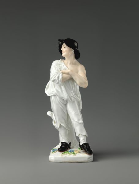 Curator: We're looking at "Four Seasons (Autumn)," a porcelain sculpture crafted between 1753 and 1755 by the Chelsea Porcelain Manufactory. Editor: It has such a delicate feel to it, doesn't it? The colors are soft, and the figure seems almost dreamlike, caught in a permanent harvest. Curator: These Chelsea figures were quite fashionable among the British elite. Porcelain signaled wealth and refined taste, aligning the owner with continental, aristocratic culture. Figures like this were often displayed in glass cabinets as conversation pieces, embodiments of classical ideals within a domestic sphere. Editor: The grapes, of course, immediately evoke Bacchus, the Roman god of wine, revelry, and fertility. Note how they are positioned in the figure's hands and draped over his shoulder. It is the potent symbol of the season’s bounty but also speaks of transformation and the cyclical nature of life. It invites reflection on mortality and renewal, themes deeply embedded in the symbolism of Autumn. Curator: And the man’s somewhat idealized appearance certainly reflects the Neoclassical revival that was budding then. These weren’t meant to portray laborers realistically but to evoke a gentrified vision of rural life. Editor: Exactly. See how his garments suggest work, yet retain a delicate aristocratic sheen. It blends idyllic imagery of rustic life with a suggestion of idealized, unburdened existence. It’s a curated symbol of ease for those who never truly labored in fields. Curator: That contrast underscores the social function of such art, reinforcing class distinctions through the very act of appreciation. Think of it—these objects presented the elite’s worldview as the epitome of culture. Editor: The enduring symbolism still works on us today. Despite being separated by centuries, these associations persist, imbuing the image with a complex meaning far beyond just simple aesthetics. It reveals a lot about persistent human fascination with natural cycles and cultural ideals of leisurely harvests. Curator: I’d agree. Looking at it, one can also see how potent the image is and how well it played into the historical construction of seasonal beauty and its associated meanings. Editor: Beautifully said.