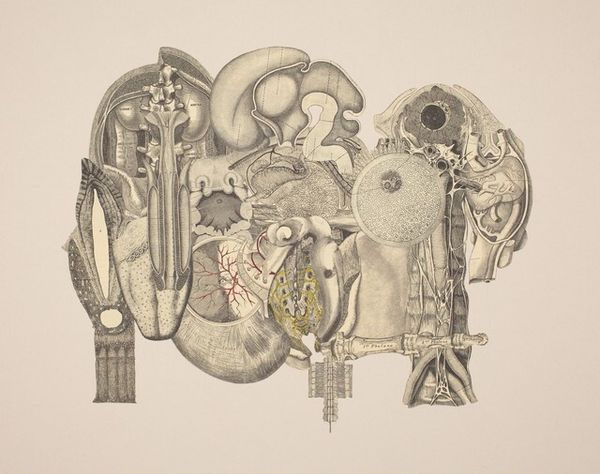 Curator: It has an eerie beauty, doesn't it? What’s your initial impression? Editor: Disturbing and fascinating. The intricate, almost scientific detail combined with the fragmented nature of the image creates this unsettling tension, like witnessing something both forbidden and integral to life itself. Curator: That's a great starting point. This is an "Untitled" work by Frederick Sommer, created in 1993. Sommer was deeply involved in exploring photography, collage, and printmaking, often combining these media in unique ways. Here, we're looking at a mixed-media collage—photographic elements juxtaposed with other materials. The materials become a conceptual playground. Editor: Right. Considering the period, I'm thinking about the AIDS crisis and the broader socio-political context surrounding the body. Sommer dissects not just anatomy, but societal perceptions of fragility, health, and mortality. Curator: Indeed. Think about the labor and skill involved in constructing something so intricate. Each layer is consciously placed, shifting the relationship between found imagery and art object. His focus transcends a single image to become something handmade, even sculptural. Editor: Absolutely. And there's a definite subversion here. The traditional anatomical illustration aimed at clinical objectivity is now disrupted. The human body becomes defamiliarized, almost monstrous, which speaks to the time and the feelings of alienation present at the end of the twentieth century. The piece highlights human vulnerabilities. Curator: True, and Sommer challenged conventional approaches. By emphasizing the collage as a constructed object, he pushed us to consider the cultural meaning of the body, and of its representation through these meticulous, deliberate layers. Editor: And how the choice to render this “objective” representation so subjectively charges the very idea of objectivity within art and science. It compels you to question the motives. Curator: The tension Sommer constructs resonates even now. Editor: Precisely, this intersectional approach offers perspectives through our collective unease with mortality. A stark reminder.