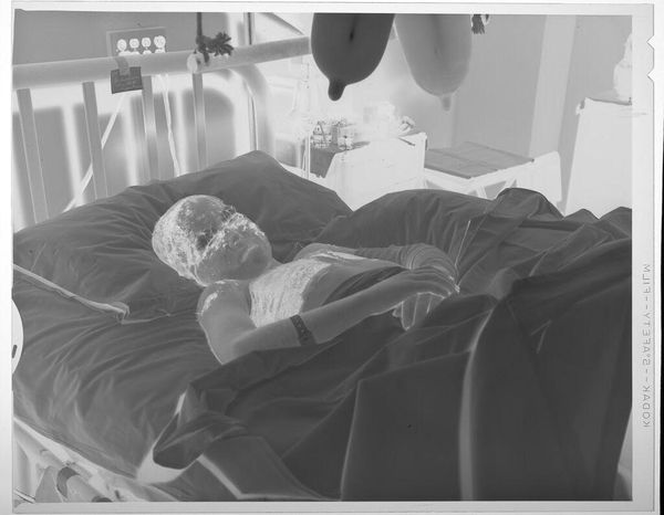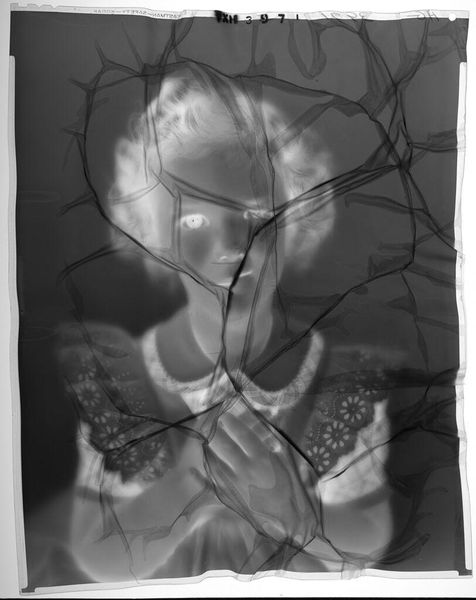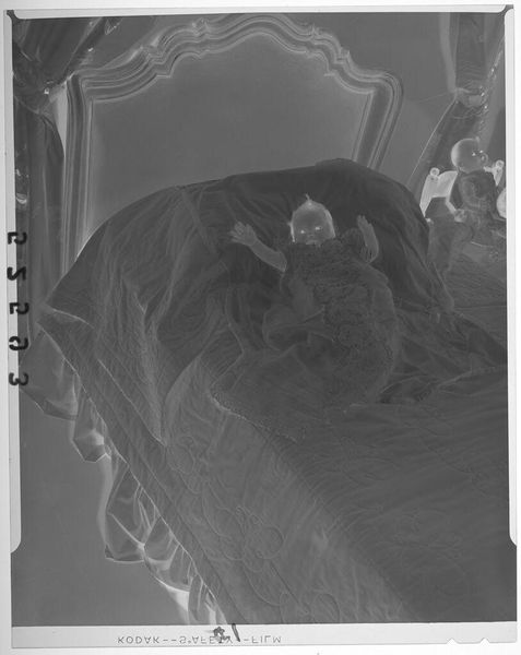 Curator: This is an untitled photograph by Martin Schweig, currently held at the Harvard Art Museums. It captures a young girl looking at a baby lying on a bed. Editor: The image has a poignant, almost haunting quality. The high contrast emphasizes the vulnerability of the children. Curator: Indeed. The image, though seemingly simple, touches upon the complex relationship of childhood, the anticipation of growth, and the symbolism of innocence. Editor: I wonder about the social context. Images of children often reflect societal values regarding family and future. What statement, if any, was Schweig making? Curator: Perhaps he was less concerned with a grand statement and more interested in capturing a tender moment, a private interaction between siblings. Editor: Ultimately, it is a study in contrasts, a reminder of the delicate balance of power and dependency within families. Curator: It leaves me pondering the universal themes of observation and the shared space of siblings.