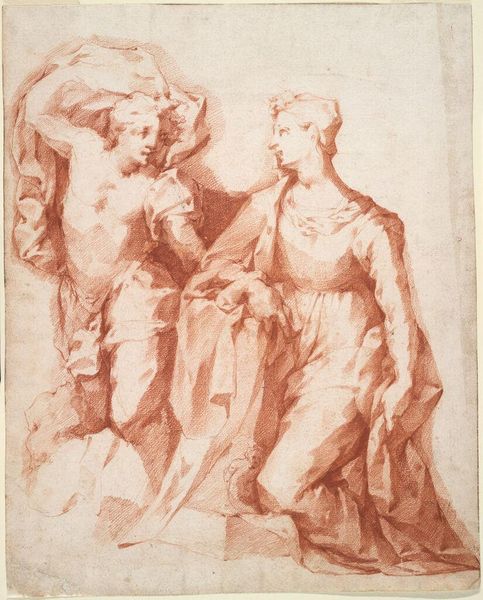 Curator: Jacques-Louis David created this preparatory drawing, “The Three Horatii Brothers,” in 1785, and it is now housed at the Musée Bonnat in Bayonne. Editor: The first thing that strikes me is the almost ghostly feel—these powerful figures emerging from a tan ground, overlaid with what looks like a grid. It reminds me of architectural planning, like these men are being constructed, brick by brick, with pure, linear devotion. Curator: Precisely. That grid emphasizes David’s commitment to Neoclassical order and structure. This sketch precedes the famous painting of the same name, a visual embodiment of Enlightenment ideals of civic duty and sacrifice, made on paper using pencil. We can situate this composition historically amidst burgeoning revolutionary fervor, and read it as an attempt to inculcate specific ideologies. Editor: Ideologies dressed in togas, no less. It’s hard to shake the feeling that beneath all the heroic stoicism there are real humans struggling, facing impossibly difficult choices. The stark simplicity highlights their humanity even more poignantly. What do you make of the repetition of forms? Curator: The repetition reinforces the collective identity of the brothers. United, they symbolize Rome’s strength and unwavering commitment to its defense, emphasizing their single-minded purpose beyond individual desires. Their arms are aligned, unified. However, this also contrasts quite painfully with the future pain their strength demands of the women linked to their destinies. Editor: I completely agree! The power in the line work gives a hint of their strength. Their bare feet ground them in the mortal realm, while those intense gazes… Well, they practically dare you to question their conviction. Seeing it this stripped down, sans the full theatrical staging of the painting, I almost get a stronger emotional resonance. Curator: This piece provides valuable insight into David’s process, and his engagement with themes of patriotism, masculinity, and political allegiance, elements often interwoven in complex ways. He forces viewers to reconsider our relationship with power, nationhood, and even death. Editor: Absolutely, there’s something profoundly raw and vital in seeing the artist work through these foundational concepts. This drawing speaks so much about strength and sacrifice and the initial process to envision that dedication. I really could keep admiring this!